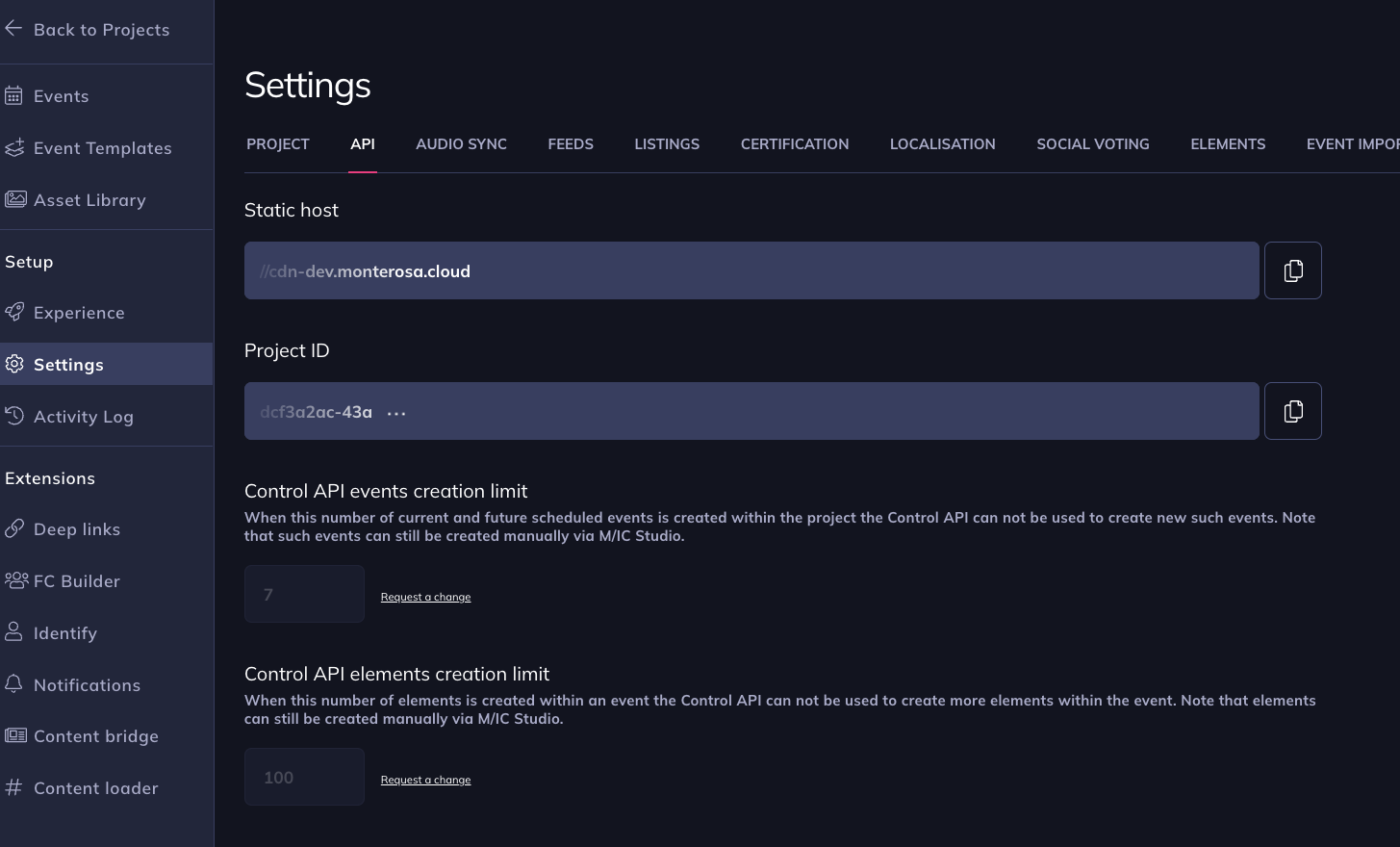 In order to embed an Experience, you'll need its Project ID and Static host. This information can be retrieved from Studio by navigating to the project, then accessing the `API` tab within the `Settings` section.